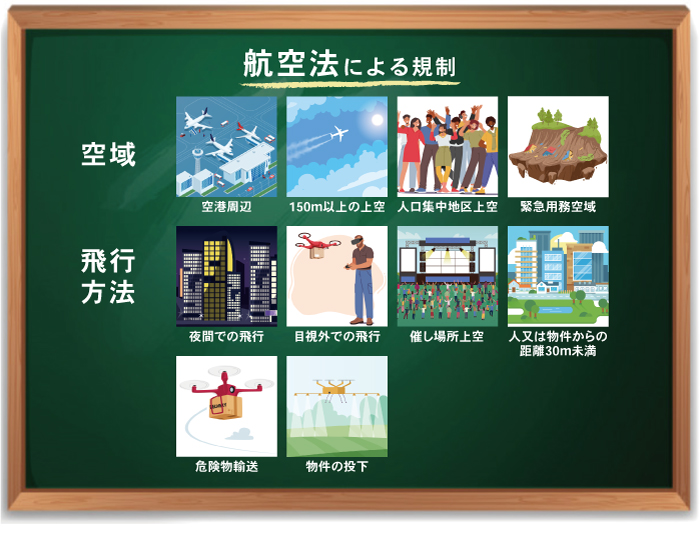 航空機の安全な運航を目的とした法律で、ドローンも「無人航空機」として規制対象となっています。 - 小型無人機等飛行禁止法