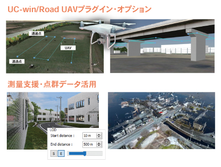 UC-win/Road UAVプラグイン・オプションは、ドローンの飛行ルートを3DVR空間内で自由に設定し、自動飛行制御することが可能です。ビデオ撮影や写真撮影が可能なので、被災地の最新の状況を計測し、航空写真や点群データとして3DVR空間に反映できます。重機作業時に作業エリア、工程に合わせて自動飛行させ、上空から監視映像を送信することもできます。