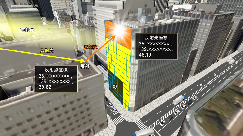 3D都市モデルを利用した建物外壁への日照シミュレータを開発。マンションの外壁タイルの点検は、多くは人力による打診で実施されているが、近年ではドローンによる赤外線調査の手法が実用化されはじめている。一方、ドローンによる赤外線調査では建築物の外壁温度が品質・精度に影響を与えるため、建築物への日照環境を事前に把握することが重要である。本システムにより外壁タイル点検のための調査計画策定を効率化させ、ドローンによる赤外線調査の普及・拡大を目指す。